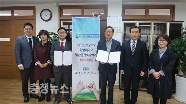 건양대학교(총장 정연주) 재난안전소방학과는 지난 24일 대전 관저중학교(교장 장명신)와 학교 안전문화 활성화 기반조성을 위한 재난안전소방 교육 프로그램 및 안전체험 프로그램 공동 운영 등을 골자로 하는 재난안전소방교육에 대한 협약식을 가졌다.