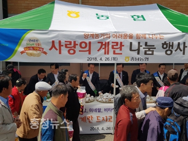 농협충남지역본부 조소행 본부장은 " 최근 계란 산지가격이 농가 생산비 이하로 떨어져 양계농가의 어려움이 가중되고 있어, 계란 소비 확대와 이웃 사랑을 실천하고자 이번 행사를 개최하게 됐다고 밝히고, 요즈음 범 농협 계란 소비촉진을 운동을 하고 있는데 많은 분들이 동참해 양계농가도 돕고, 계란으로 건강을 챙기시길 바란다”고 하였다.