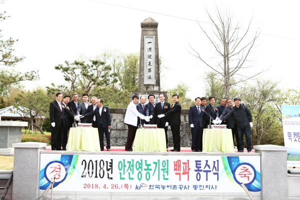 한국농어촌공사(사장 최규성)는 26일 김제·정읍·부안 간선수로 6,800km의 시작점인 낙양취입수문에서 안전영농과 믿을 수 있는 먹거리 생산을 기원하는 백파제 통수식을 가졌다.