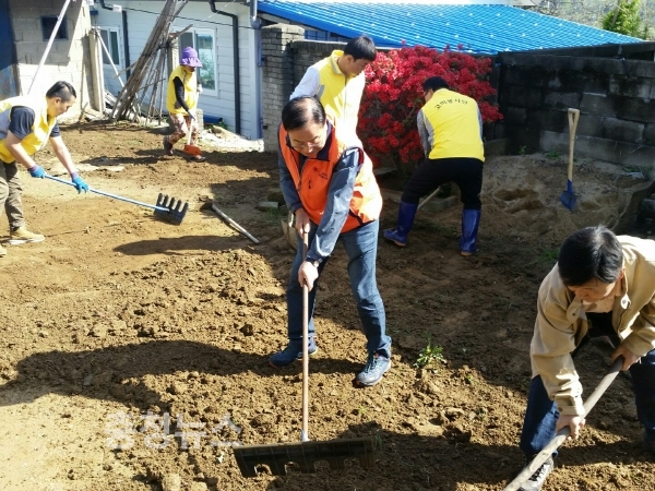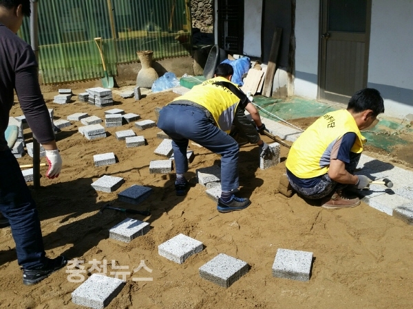 지난 25일에는 자원봉사단체인 특수임무 고마봉사단(단장 박형진) 회원과 함께 공주시 사곡면의 독거노인(장애인) 주 모씨의 가정을 방문해 비포장 마당을 깨끗하게 정리하고 보도블럭을 설치, 마당뜰 고르기 1호점을 완공했다.