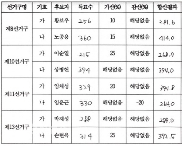 8-노종용, 10-상병헌, 11-임채성, 13-손현옥, 14-유철규, 15-이윤희, 16-손인수 후보
