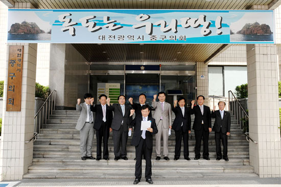 이날 중구의회 의원들은 “지난 7월14일 일본정부가 독도를 자국영토라는 내용을 중학교 사회과 학습지도요령 해설서에 명기하며 독도의 영유권을 주장하는 것에 대해 분노를 터뜨린다”며 일본정부와 우리정부에 4가지 결의를 시행하도록 촉구했다.