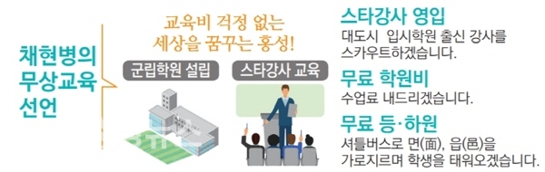 채 후보는 "각 지역의 읍·면장을 지역민이 투표로 선출하는 인사제도를 만들어 우리사회의 또 다른 적폐 보은인사 청산하겠다"고 밝혔다.