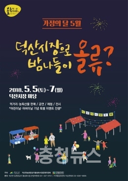 어린이날과 어버이날을 맞아 덕산시장 마당(덕산면 읍내길 13)에서 12시부터 오후 10시까지 개장되는 야시장 ‘덕산으로 올류(all you)’는 관광객과 인근 도시지역에 덕산만의 먹거리와 농특산물을 홍보하고, 체험과 공연 프로그램을 통해 지역문화를 함께 누리는 환경을 만들고자 기획됐다.