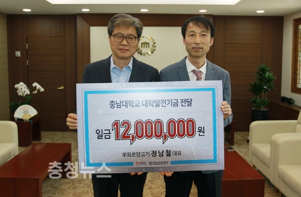 오덕성 총장과 정남철 대표 대전 유성구 지족동 소재 羊화로양고기 정남철 대표는 3일 오후 3시 오덕성 총장을 방문해 대학발전기금으로 써 달라며 1200만 원을 전달했다. 저작권자 © 충청뉴스 무단전재 및 재배포 금지 김윤아 기자 다른기사 보기 기사가 마음에 드셨나요? 충청뉴스 좋은 기사 후원하기 1,000원 3,000원 5,000원 10,000원 30,000원 50,000원 직접입력 비회원 약관동의하기 ※ 소중한 후원금은 더 좋은 기사를 만드는데 쓰겠습니다.