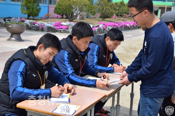 특히나 선수단의 방문 소식에 김정원 학생은 유니폼을 입고 와 선수들을 놀라게 했다. 평소 아산무궁화프로축구단의 팬이라는 김정원 학생은 “경기장에서 보던 선수들을 직접 만나서 기쁘다. 일일 선생님으로 오셨는데 시간이 너무 빨리 지나간 것 같다. 선생님과 약속했듯 응원하러 꼭 운동장으로 갈 것”이라고 말하며 미소 지었다.