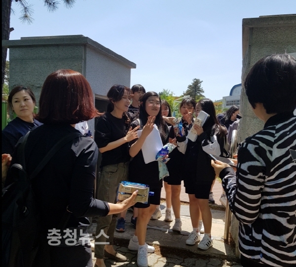 이날 학부모들은 교문에서 귀가하는 학생들에게 작은 선물과 함께 ‘오늘도 수고했어!’라며 응원과 위로의 말을 건네며 학생들을 격려했고,