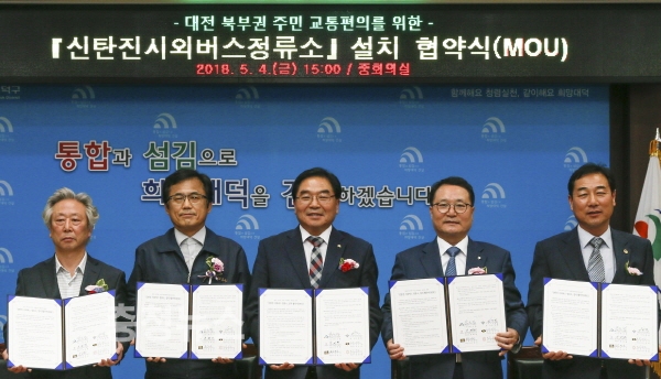 대전 대덕구(구청장 박수범)가 신탄진번영회(회장 이상복), 대전복합터미널(주)(대표 부재원), ㈜금남고속․㈜중부고속(대표 조성일), ㈜한양고속(대표 이경수)과 함께 손을 맞잡고 ‘신탄진시외버스정류소’설치를 위한 협약을 체결했다.
