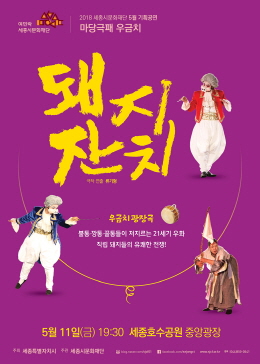 세종시문화재단(대표이사 인병택)은 5월 가족의 달을 맞아 온 가족이 즐길 수 있는 공연 ‘마당극 돼지잔치’를 오는 11일 저녁 7시 30분부터 세종호수공원 중앙광장에서 진행한다.