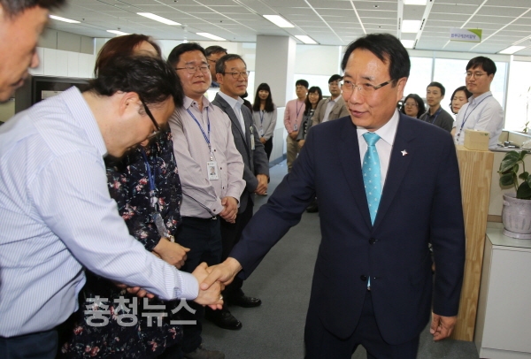 한현택 동구청장은 예비후보 등록을 앞둔 9일 동구청 각 부서를 찾아가 직원들과 일일이 악수를 하며 행정공백에 따른 업무누수가 발생하지 않을 것을 당부했다.
