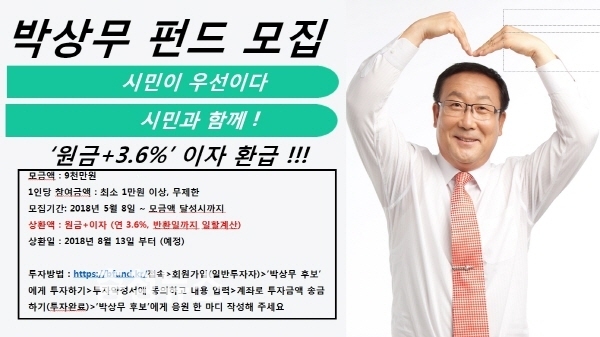 박상무 시장후보는 “시민들로부터 투명하고 공개적인 선거자금을 모금하기 위해 지난 8일 오전 9시부터 선거펀드를 개설, 9일 정오까지 3000만원이 넘게 투자돼 1차 마감 되었다”고 밝혔다.