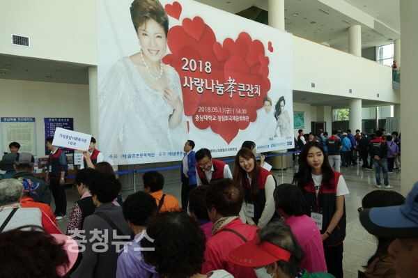 골프존문화재단이 11일 가정의 달을 맞이하여 대전 충남대학교 정심화국제문화회관에서 독거 및 소외계층 어르신 1,650여명을 초청해 ‘2018 사랑나눔효큰잔치’를 개최했다. 참석한 어르신들이 행사장으로 입장하고 있다.