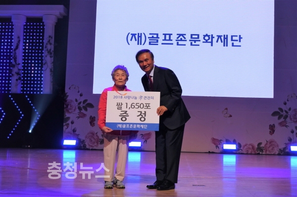 . 골프존문화재단 김영찬 이사장이 11일 대전 충남대학교 정심화국제문화회관에서 개최된 ‘2018 사랑나눔효큰잔치’에서 어르신께 쌀을 전달하고 있다.