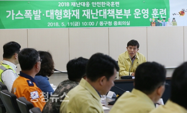 대전 동구는 11일 구청 중회의실에서 2018년 재난대응 안전한국훈련 4일차로 노인복지시설 가스폭발·대형화재 대응 훈련을 실시했다.