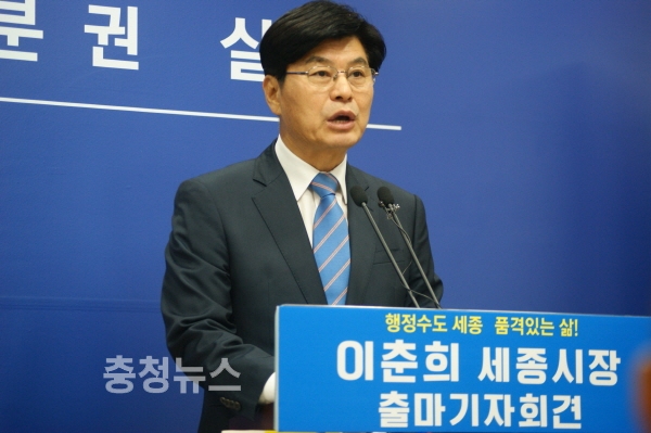 이춘희 세종특별차치시장이 14일 6.13지방선거 예비후보 등록후 세종시청 브리핑룸에서 ‘행정수도 세종, 품격있는 삶’이라는 시정비전을 내걸고 재선 출마를 선언했다.