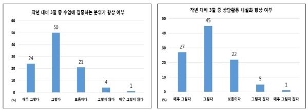 3월의 수업과 상담활동에 대해 학부모들은‘수업에 집중하는 분위기가 향상되었다’와‘상담활동이 내실화 되었다’에 각각 74%, 72%로 응답하여 새학년 준비 과정이 수업과 상담활동의 몰입도에 긍정적인 영향을 준 것으로 나타났다.