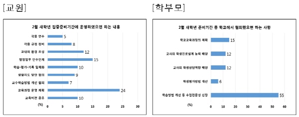 새학년 준비 기간에 주로 다루었으면 하는 주제로, 교원은 교육과정 운영 계획의 수립이나 업무인수인계, 수업-평가-기록 방법의 개선 등에 관한 내용을 꼽았으나, 학부모는 교사들의 전문적인 수업능력의 신장을 최우선으로 요구하였다.