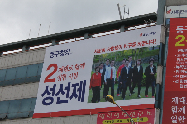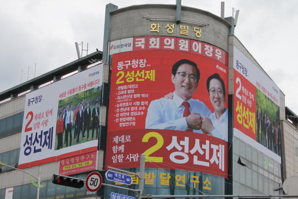 새로 교체된 현수막은 해당 지역구 국회의원인 이장우 의원과 함께 찍은 사진을 전면에 내세우고, '제대로 함께 일할 사람'으로 국회의원과 구청장이 하나돼 더 좋은 동구 발전을 더욱 가속화 시킬 수 있다는 메시지를 선보였다.