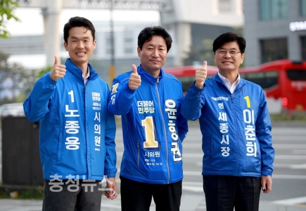 이춘희 세종시장 후보는 16일 세종시 신흥사거리에서 노종용(8선거구), 윤형권(9선거구)세종시의원 예비후보들과 함께 출근인사에 나섰다.