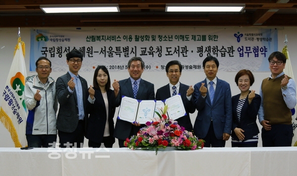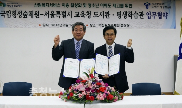산림청 한국산림복지진흥원은 지난 16일 강원도 횡성군 둔내면 국립횡성숲체원(원장 장관웅)에서 서울특별시교육청도서관‧평생학습관(관장 이강태)과 ‘산림복지서비스 활성화 및 청소년 이해도 제고를 위한 업무협약(MOU)’을 체결했다고 밝혔다.