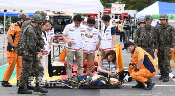 대형마트에서 가스폭발로 인한 붕괴 후 대형화재가 발생한 상황을 전제로 시민 대피, 부상자 이송, 화재진압, 복구활동 등 신속한 재난 대응을 위해 13개 유관기관 관계자와 시민 등 200여명이 참여해 실제상황처럼 훈련에 임했다.