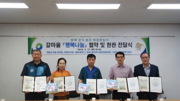 대전 서구 갈마1동(동장 이선주)은 17일 갈마1동 회의실에서 갈마1동 지역사회보장협의체(공동위원장 최재인), 태평소국밥 갈마점과 토종추어탕, 엘림 세탁소가 참여한 가운데, ‘갈마울 행복나눔 업무협약’을 체결했다고 밝혔다.