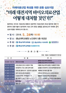 충남대학교병원(원장 송민호) 의생명연구원은 충남대학교 의과대학, 대전광역시와 공동으로 <미래 대전지역 바이오의료산업 어떻게 대처할 것인가?>란 주제로 24일 충남대학교병원 노인센터 5층 대강당에서 심포지엄을 진행한다.