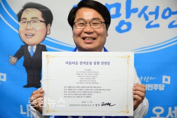 오세현 더불어민주당 아산시장 후보가 20일 아름다운 선거운동 실천을 다짐했다.