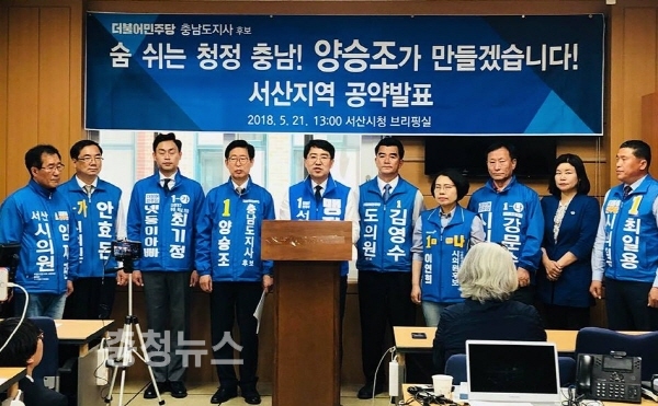 21일 더불어민주당 충남도지사 양승조 후보와 서산시장 맹정호 후보는 서산시청 브리핑룸에서 미세먼지 관련 공동기자회견을 가졌다.