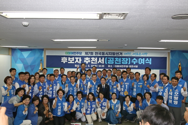 더불어민주당 대전시당(위원장 박범계)은 22일 소속 시구의원 후보자 70여명에게 후보자 추천서(공천장)를 수여하고 6.13지방선거 승리를 다짐했다.