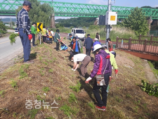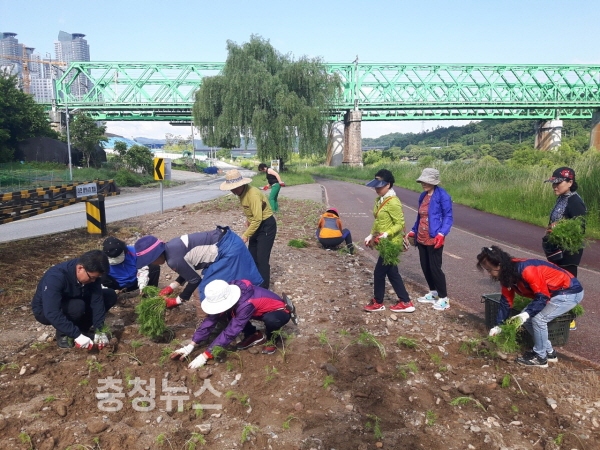 대전 대덕구 신탄진동(동장 강동구)이 23일 대전 시민의 대표적인 힐링공간인 금강변 하상 산책로 주변의 자투리땅에 동 자생단체 회원 등 60여명이 참석한 가운데 코스모스 꽃밭을 조성했다.