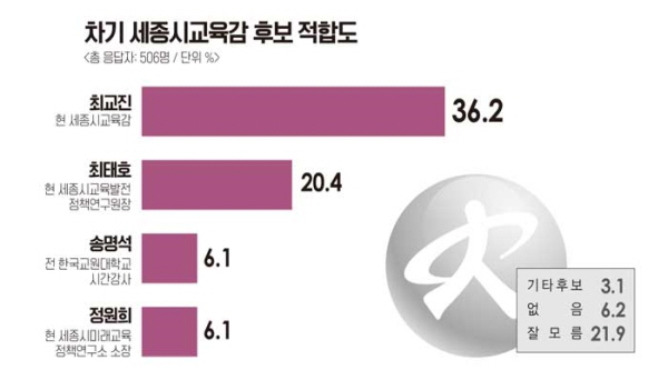 6·13지방선거에 출마하는 차기 세종특별자치시 교육감장 후보 가운데 누가 가장 적합한가를 묻는 ‘차기 세종시 교육감 후보 적합도’ 조사에서 최교진 후보(현 세종시교육감)가 36.2%로 1위를 차지했다.