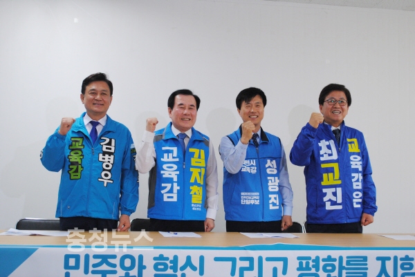 성광진 대전교육감 후보, 최교진 세종교육감 후보, 김지철 충남교육청 후보, 김병우 충북교육감 후보는 24일 성광진 후보 사무소에서 ‘민주, 혁신, 평화를 지향하는’ 공동 공약 발표 기자회견을 열었다.