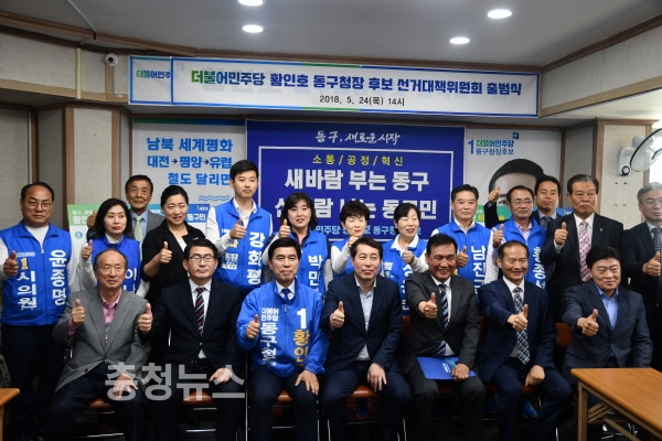 축사에 나선 강래구 동구 지역위원장은 “황 후보의 용광로 선대위 구성을 통해 이번 지방선거에서 압승을 자신한다”며 “지방정부의 완성을 위해 황 후보를 비롯한 시·구의원 후보들도 동구의회에 입성시켜 새로운 동구를 만들어야 한다”고 지지를 호소했다.