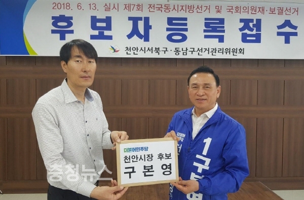 더불어민주당 구본영 천안시장 후보는 24일 선관위 후보등록을 마친 뒤 “지난 4년의 경험과 천안시민들의 믿음과 신뢰를 바탕으로 더 큰 천안, 더 큰 행복을 위해 민선 7기 천안시장에 다시 출마했다”고 포부를 밝혔다.