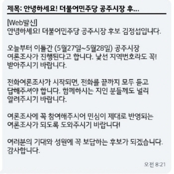문제의 발단은 김정섭 공주시장 후보 측이 27일 오전 보낸 여론조사 안내 문자다.