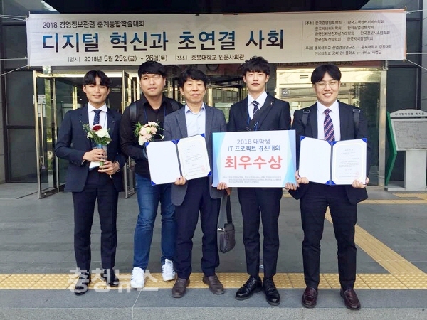 한남대에 따르면, 글로벌IT경영학과 G-IT팀(강현, 윤홍식, 조성철, 윤한수 학생)은 지난 26일 충북대에서 개최된 이 대회에서 ‘클라우드 컴퓨팅 기반 법인차량관리시스템’을 출품해 최우수상을 차지했다. 또한 학생들을 지도한 강신철 교수는 최우수 지도교수상을 받았다.