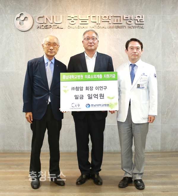 충남대학교병원(원장 송민호)은 ㈜청암 이언구 회장이 충남대학교병원 의료소외계층 지원기금 1억원을 기부했다고 28일 밝혔다.