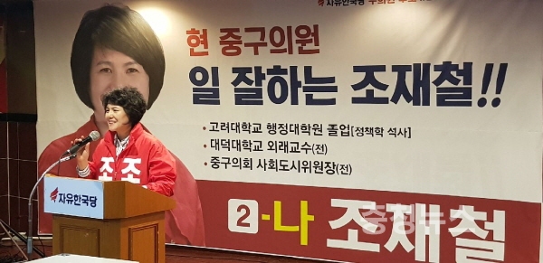 조재철(중구 라선거구-2-나 유천1,2동,문화1,2동,산성동) 후보는 인사말에서 "지난 4년 전 초선때처럼 주민을 위한 일이라면 누구하고도 싸워서 관철시켰다"며 "재선에 성공한다면 더 많은 지역의 숙원사업을 위해 봉사하겠다"고 지지를 호소했다.