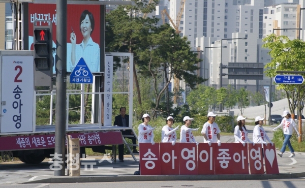 이날 송 후보의 둘째딸인 세진양은 율동을 하면서 어머니를 도와 거리유세 지원에 나서 시민들의 눈길을 끌었다.