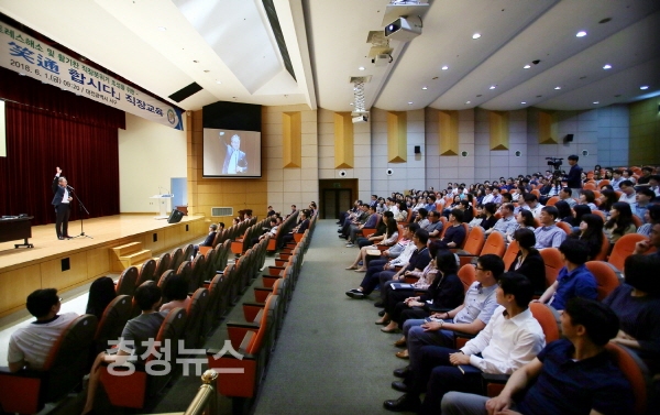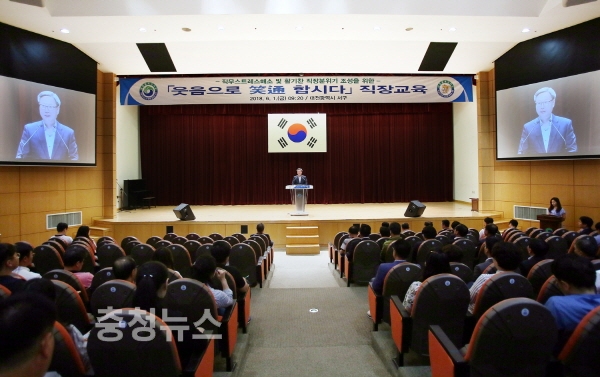 대전 서구는 1일 구청 대강당에서 강철식 서구청장 권한대행을 비롯해 직원 400여 명이 참석한 가운데 ‘웃음으로 소통 합시다’ 직장 교육을 실시했다고 밝혔다.