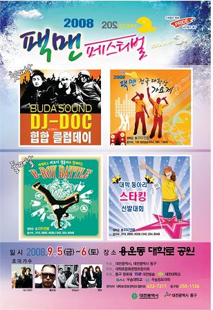 “뜨거운 열정과 에너지로 가득한 젊음을 만끽하세요!” 대전 동구(구청장 이장우)는 오는 5일, 6일 용운동 대학로 공원 일원에서 「도전하는 꿈! 발산하는 젊음!!」이라는 주제로‘2008 202 STORY 팩맨 페스티벌’을 개최한다.