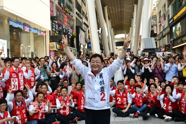 박성효 자유한국당 대전시장 후보가 2일 열린 대규모 합동유세에서 2번을 찍어달라고 호소하고 있다.