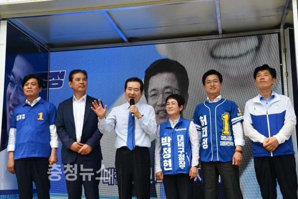 정 전 의장은 “(대덕에서)승률이 그렇게 높지 않았지만 오늘은 이곳에 오며 박 후보를 확실하게 당선시켜 주실 것 같아 가슴이 떨린다”며 “박 후보는 8년간 시의원을 지내며 지역뿐만 아니라 대전시정에 대해서도 잘 안다. 박 후보를 구청장으로 선택해 주시면 대덕구를 위해 틀림없이 잘 할 것”이라고 박 후보를 치켜세웠다.