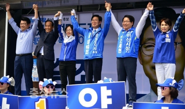 오세현 아산시장 후보는 유세연설에 나서 “지금껏 쌓아온 모든 역량을 발휘해 시민들의 삶이 나날이 나아지는 행복 아산을 만들겠다”고 화답하며 지지자들의 호응을 이끌었다.