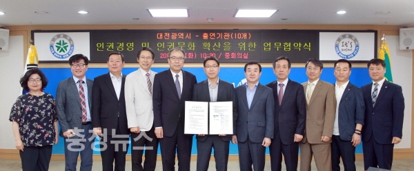 대전시는 5일 시청 중회의실에서 대전시 10개 출연 기관과 ‘인권경영 및 인권문화 확산을 위한 업무협약’을 체결했다.