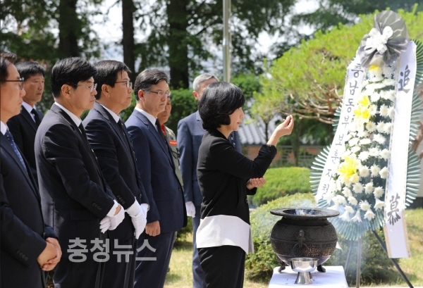 한국당 송아영 세종시장 후보도 일찍 자유한국당 당직자, 시의원 후보들과 충령탑을 참배한 뒤 현충일 추념식 참석과 조치원 읍내 순회 유세와 한솔동 거리인사를 펼쳤다.