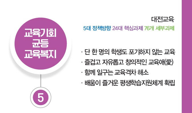 또 학교 텃밭 가꾸기 등 자연체험 활동 지원, 학교 밖 청소년을 위한 지원 강화, 기초학력 보장 책임교육 완성, ‘교육환경 취약 학교’ 집중 지원, 학습자 중심의 맞춤형 평생학습 지원 확대를 실현하며, 재원은 자체예산과 교부금, 지방교육비로 마련한다.
