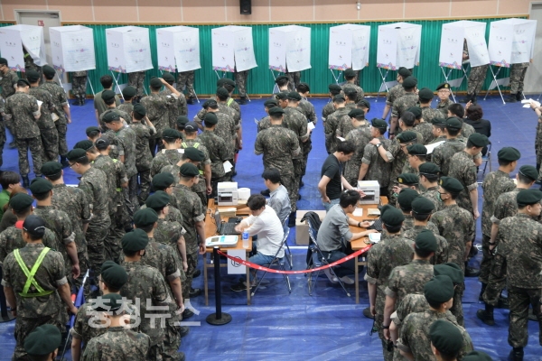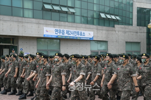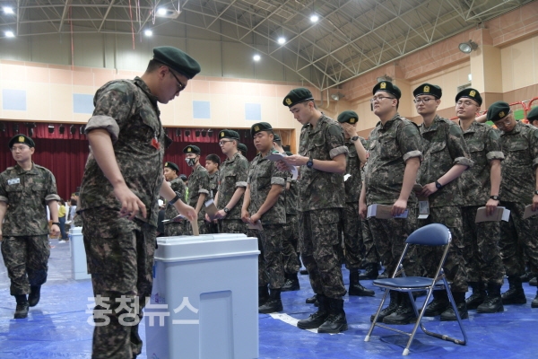 6월 13일 실시되는 제7회 전국동시지방선거 사전투표 첫날인 8일 오전 연무문화체육센터에 마련된 사전투표소에서 논산 육군훈련소 훈련병과 기간병 장교들이 투표를 하고 있다.