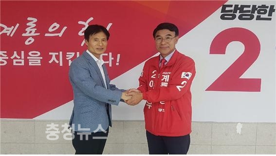 김학영 前 계룡시의회 의장이 9일 저녁 자유한국당 이응우 계룡시장 후보 지지를 선언하며 캠프에 전격 합류했다.